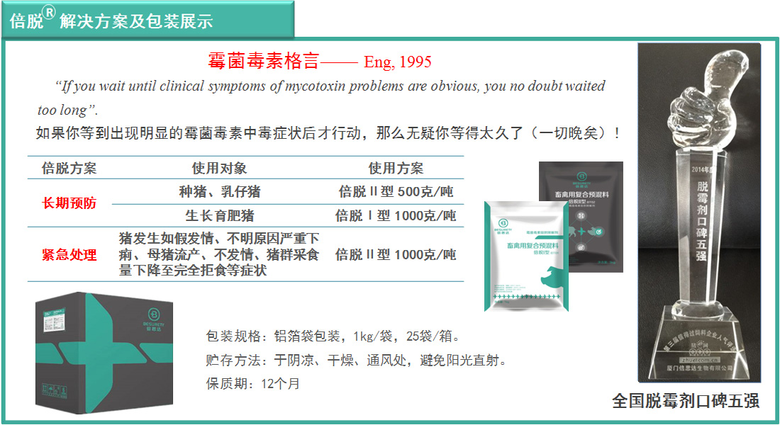 危害:采食量降低或拒食;生长迟滞,饲料报酬变差;免疫功能降低;肝胆肿大,受损和癌变;减少产蛋率和产奶量;影响生殖系统,胚胎坏死,胎儿畸形,贫血、